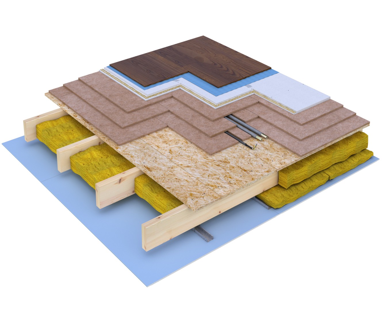 na stropě, roznášecí vrstva betonová mazanina, izolace z pěnového polystyrenu, teplovodní podlahové vytápění